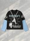 ROMWE MEN Street Life 男士拼布二合一印花长袖 T 恤,宽松短款,适合秋季
