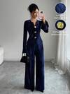 Elenzga 女式法式休闲宽松天鹅绒奢华时尚长袖金属纽扣装饰 T 恤和时尚阔腿裤 2 件套,适合日常穿着