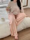 Dazy Plus 2 件大码女式纯色圆领宽松睡衣上衣和条纹裤睡衣套装