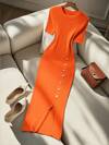 Franclia 女士优雅修身圆领短袖开衩装饰纽扣针织连衣裙,夏季大学针织毛衣