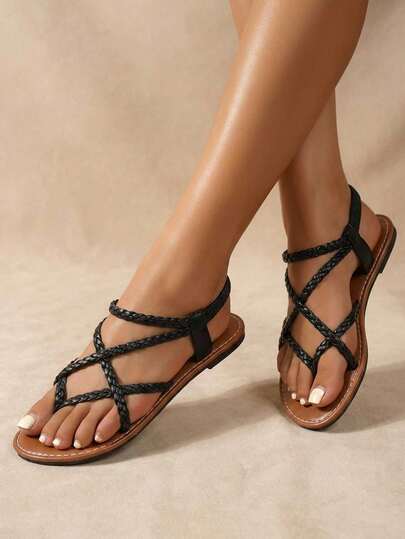 planare 女士黑色编织带平底凉鞋,舒适弹性后跟一脚蹬夏季休闲鞋,轻便交叉带沙滩/度假/日常穿着凉鞋 - 黑色 - 查看 1