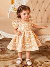 SHEIN 嬰兒女孩休閒、優雅、復古風格短袖泡泡裙,帶有花卉印花圖案,彈性袖口和腰帶