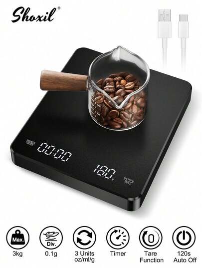 shoxil 1个带定时器的电子咖啡秤,可充电式意式咖啡秤,3公斤/0.1克(250毫安时),迷你咖啡秤/滴滤咖啡秤,食品秤,三种计量单位可选,去皮功能,自动关机,计量单位:克/盎司/毫升 - 黑色 - 查看 1