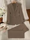 女士优雅咖啡棕色纯色单排扣长袖翻领修身西装外套及长裤两件套,春秋季