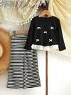 2 件女童时尚蝴蝶印花黑色 T 恤上衣和休闲阔腿蝴蝶装饰牛仔裤套装,适合日常、户外、学校、通勤、春秋季