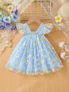 女婴度假雏菊印花网眼荷叶边吊带泡泡纱连衣裙,适合派对和玩耍,夏季